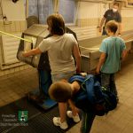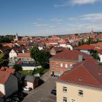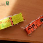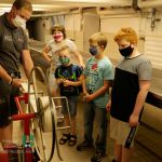 Im Schlauchlager stellten die jüngsten Feuerwehrleute fest, dass alle hier deponierten Schläuche „zusammengeschraubt“ wohl mehr als ein Kilometer sein müssen. In der sog. Waschanlage erläuterte Alexander Tilz das hier praktizierte Vorgehen. Der Gerätewart nahm einen getrockneten, sauberen Schlauch aus dem Turm ab und demonstrierte, wie hier die Schläuche mit einer Maschine aufgerollt und dann ins Lager verbracht werden. Im Anschluss kam ein benutzter, schmutziger Schlauch an die Reihe. Zunächst müssen die hier abgegebenen Schläuche mit 16 bar abgedrückt und auf Dichtheit geprüft werden. Anschließend wird der Schlauch durch die „Waschmaschine für Feuerwehrschläuche“ und danach mit einem Seil in den Schlauchturm hinaufgezogen. Hier bleibt er ungefähr eine Woche zum Trocknen, bevor er, wie schon geschildert, mit einer Maschine aufgerollt wird. Bei all diesen Tätigkeiten setzte Alexander Tilz die Kinder bei gefahrlosen Aktionen mit ein und lies diverse Schalter betätigen oder Handgriffe ausführen. Nach der Demonstration im Keller erklommen die Kids 122 Stufen und gelangten so in die oberste Etage des Schlauchtrockenturms. Sehr beeindruckt zeigten sich die Kleinen, als sie 22 Meter tief in den Keller schauen konnten. Ebenso fasziniert waren sie vom Ausblick über die Dächer der Stadt. Ein Junge rief lauthals: „Da ist das grüne Turm-Dings mit der Glocke!“ – gemeint war der Rathausturm. Zum Abschluss der Gruppenstunde bekamen die Kinder noch Schlauchreste, die mit Ösen versehen, als Schlüsselanhänger genutzt werden können.
