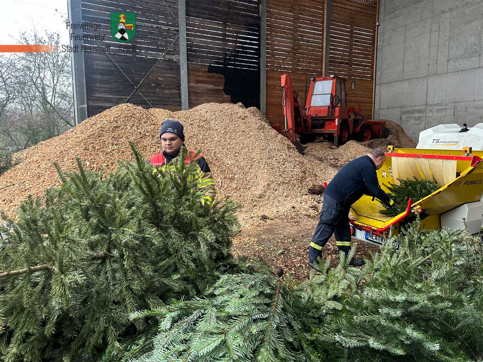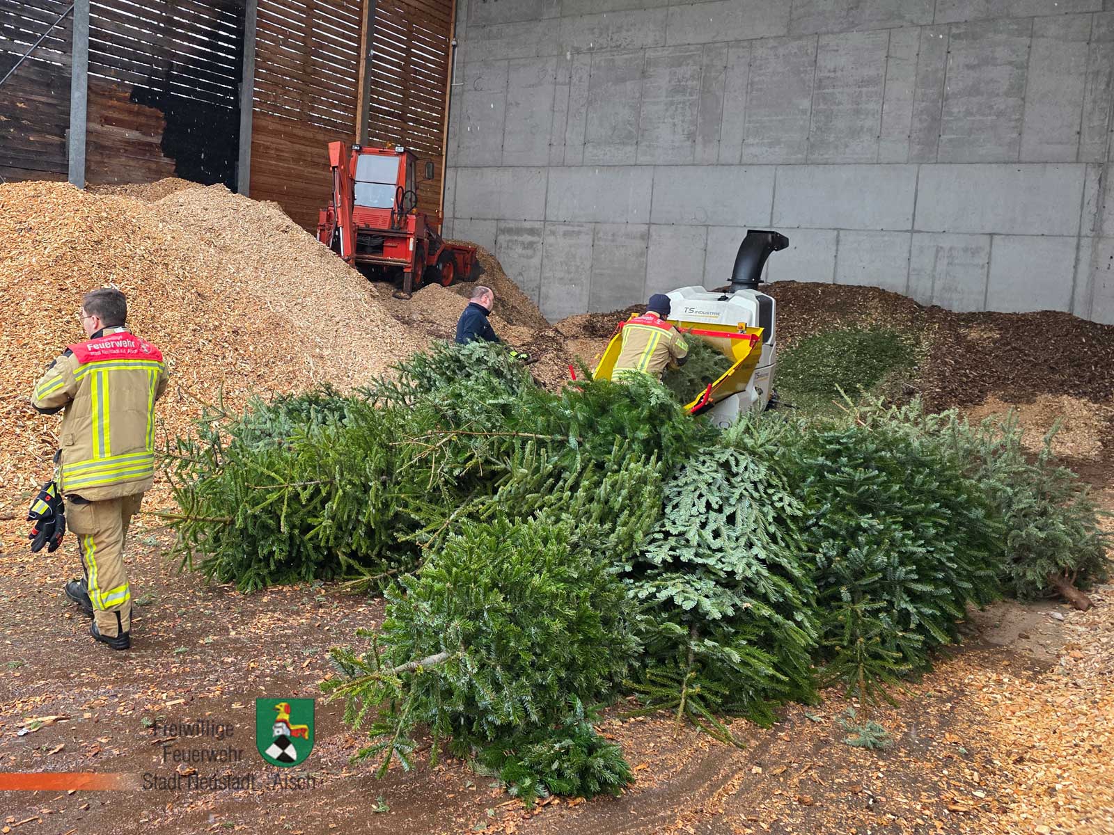 Den ausgedienten Weihnachtsschmuck brachten die fleißigen Feuerwehranwärter zum Heizkraftwerk in der Comeniusstraße. Dort wurden die Christbäume am Nachmittag direkt vor Ort gehäckselt und werden in Kürze als Brennstoff Verwendung finden.