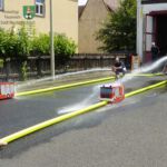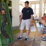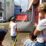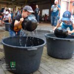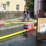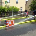 Acht Spielstationen hatten die Feuerwehrhelfer am Vormittag für die Veranstaltung aufgebaut. Neben Geschick, Feingefühl, Konzentration und Energie war jeweils auch etwas Glück gefordert. Beim Spreizer-Spiel hatten die Kinder die Aufgabe, mit einem Rettungsspreizer gefüllte „Wasserbomben“ behutsam von einem Verkehrsleitkegel zu einem anderen zu transportieren. Große Löcher in einem ausrangierten Sprungretter waren die Ziele für Schwämme, die von Kindern an der zweiten Station getroffen werden sollten. Mit dem Wasserstrahl aus einem echten Strahlrohr waren beim „Wasser-Minigolf“ Tennisbälle in Löcher zu bugsieren. Ruhige Hände und Geschick waren beim „Heißen Draht“ und bei der „Hindernisfahrt“ gefragt. Einmal galt es, der Drahtkontur eines Feuerwehrautos mit einem Metallring zu folgen, ohne dass es zum „Alarm auslösenden“ Kontakt kommt. Beim anderen waren zwei Schnüre die Steuerung, mit dem ein Feuerwehrauto auf einer schräg stehenden Platte ans Ziel „zu fahren“ war – ohne von der aufgemalten Fahrbahn abzukommen, denn das hätte den Verlust der Beladung (ein Golfball) zur Folge gehabt. Das Anziehen einer (Kinder-)Einsatzuniform und das Wasserschöpfen mit ausgedienten (und durchlöcherten!) Feuerwehrhelmen sind seit vielen Jahren fester Bestandteil des Spieleangebots und bei den Kindern sehr beliebt. Ebenfalls ein Wasserspiel ist die „Schlauchfahrt“, bei dem Holz-Feuerwehrautos mit Wasserkraft auf einem Schlauch entlang zu bewegen sind – in direkter Konkurrenz mit einem anderen Kind.