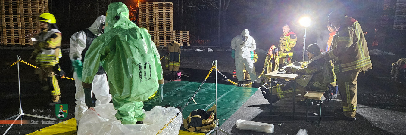 Neustadt – Eine realitätsnahe Übung absolvierte der Fachbereich Gefahrgut und Strahlenschutz der Feuerwehr Neustadt am Mittwoch, 26.11.2025, auf dem Betriebsgelände der Firma FRANKEN BRUNNEN, einem örtlichem Getränkehersteller.