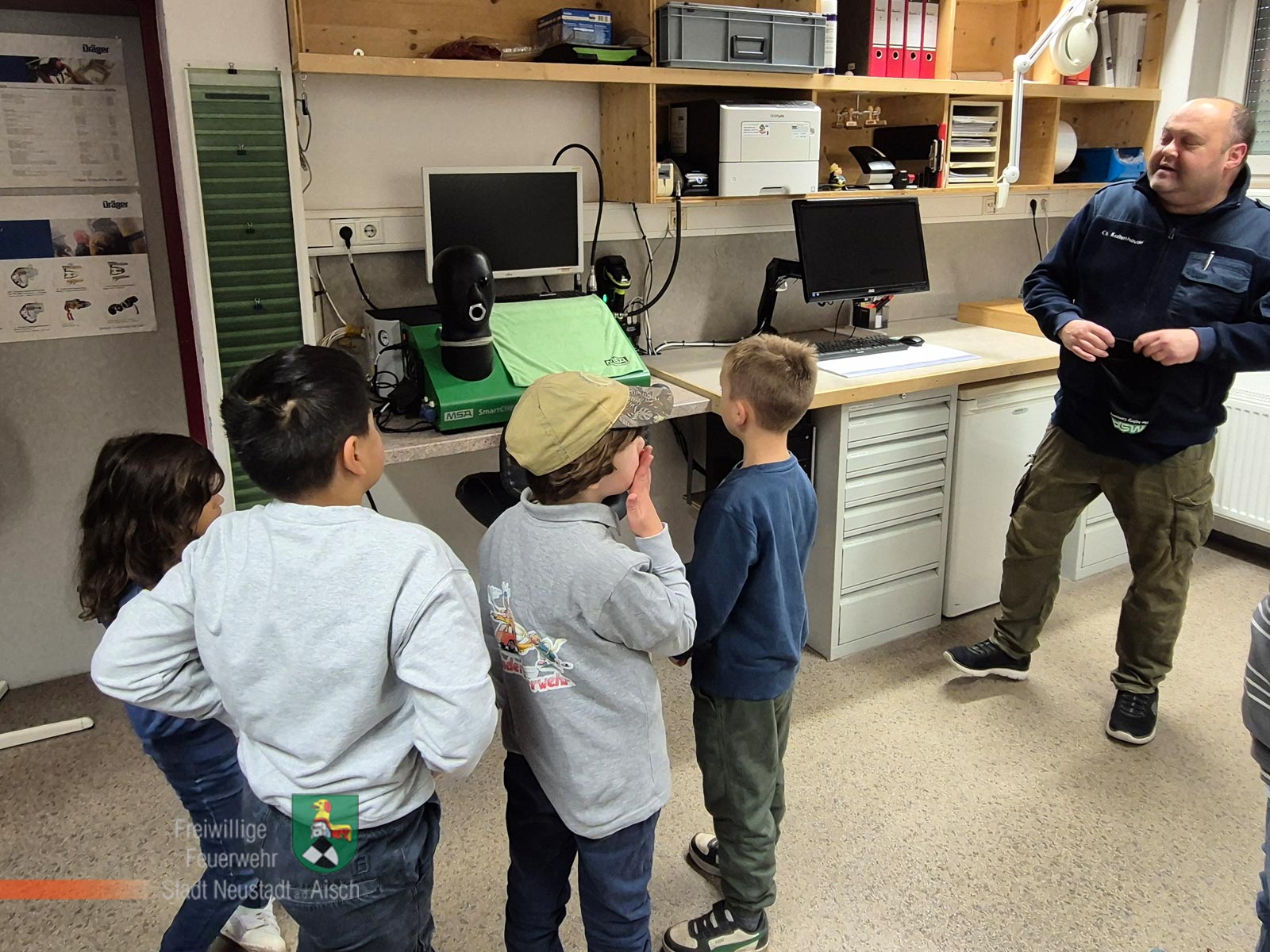 Die lebensrettende Atemschutzausrüstung bedarf besonders sorgfältiger Pflege und Wartung. Dass es dafür sogar eine eigene und speziell ausgestattete Werkstatt gibt, erläuterte Feuerwehrmann Chris Kaltenhäuser dem Feuerwehrnachwuchs. Chris führte die Kinder durch die Räumlichkeiten und stellte ihnen die besonderen Gerätschaften vor.