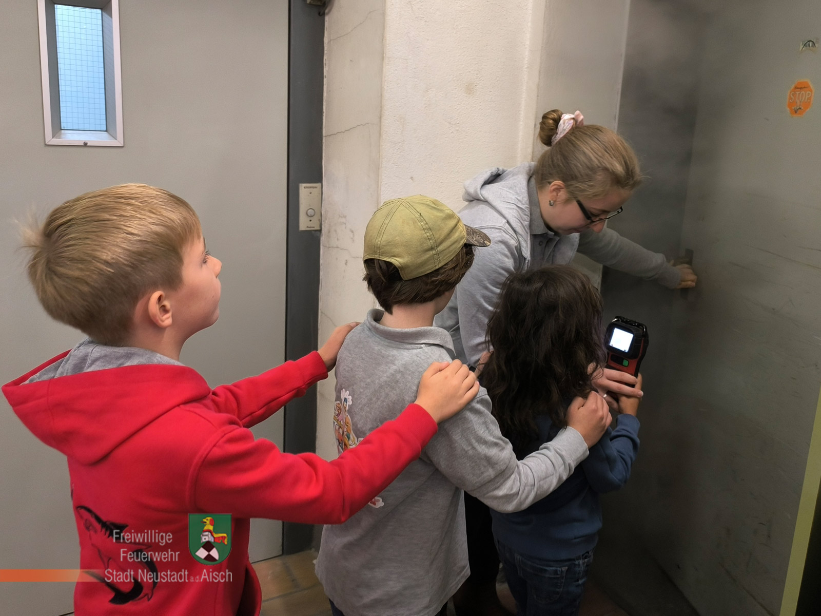 Zusammenarbeit im Team war bei der dritten Station erforderlich, um, spielerisch versteht sich, eine vermisste Person zu suchen und zu retten. Allerdings „nicht einfach so“, sondern unter erschwerten Bedingungen: Ein Raum war mit einer Nebelmaschine „verraucht“ worden, dass man die Hand vor Augen nicht sah. Unter Anleitung und unter Zuhilfenahme einer Wärmebildkamera fanden die „kleinen Trupps“ dennoch sehr schnell die zu rettende Person.