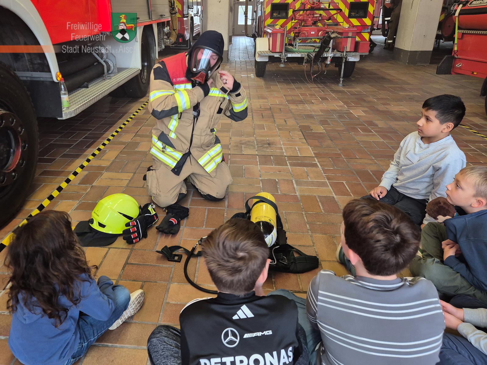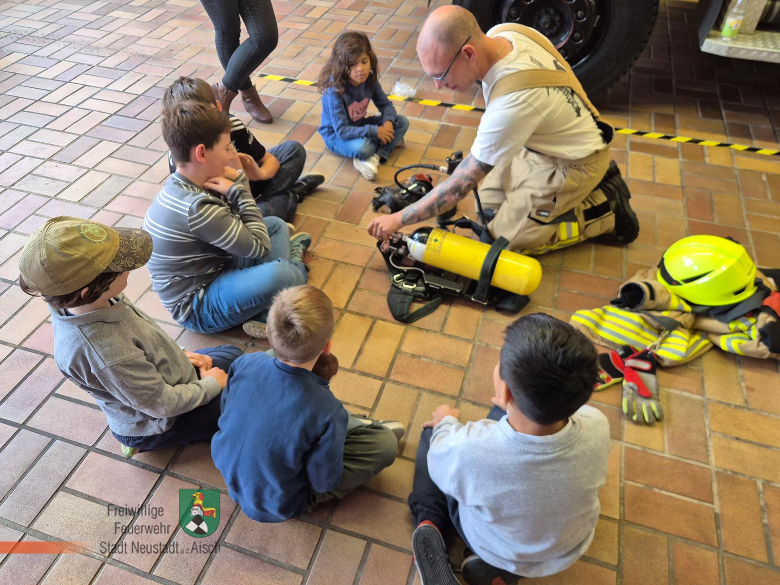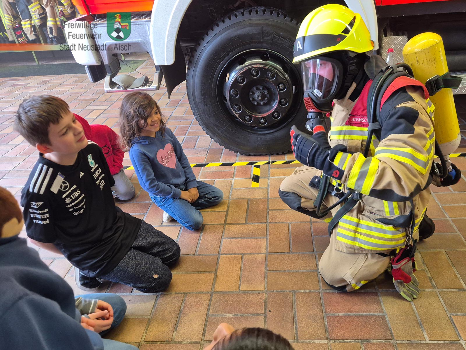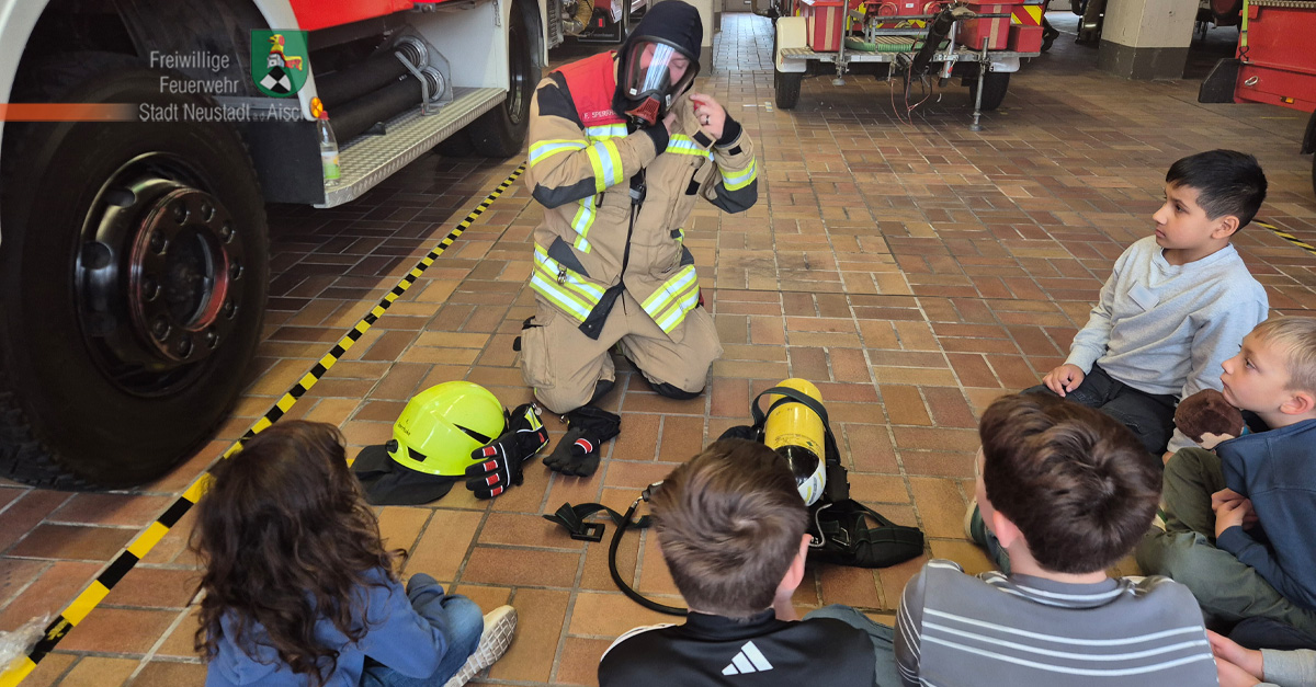 Los ging es mit der Frage, was einen Atemschutzgeräteträger überhaupt ausmacht. Feuerwehrmann Florian Sperrhake zeigte und erklärte den Kindern die erforderliche Ausrüstung und führte ihnen vor, wie diese angezogen und angelegt wird – und wie es sich anhört, wenn ein Feuerwehrmann durch seine Atemschutzmaske ein- und ausatmet. Damit wurden den Kindern aufgezeigt, dass beim Atmen durch die Maske zischende und schnaubende Geräusche entstehen, von denen keinerlei Gefahr ausgeht – im Gegenteil!