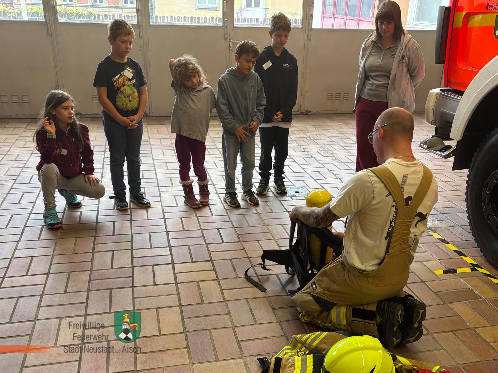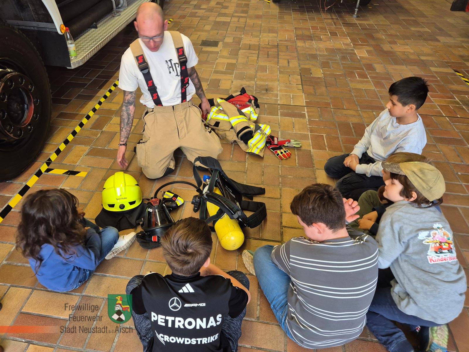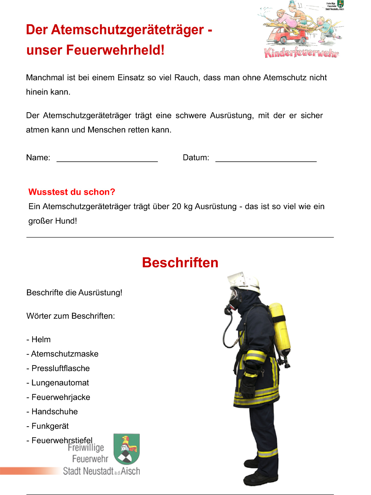 Los ging es mit der Frage, was einen Atemschutzgeräteträger überhaupt ausmacht. Feuerwehrmann Florian Sperrhake zeigte und erklärte den Kindern die erforderliche Ausrüstung und führte ihnen vor, wie diese angezogen und angelegt wird – und wie es sich anhört, wenn ein Feuerwehrmann durch seine Atemschutzmaske ein- und ausatmet. Damit wurden den Kindern aufgezeigt, dass beim Atmen durch die Maske zischende und schnaubende Geräusche entstehen, von denen keinerlei Gefahr ausgeht – im Gegenteil!