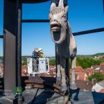So wurden am Samstag, den 29. Mai, in einer 5 ½-stündigen Aktion in Neustadt, Forst, Gerhardshofen, Dachsbach und Uehlfeld insgesamt acht Storchennester „angefahren“. Am Neustädter Rathaus und in Forst konnten je drei Jungstörche und in Gerhardshofen elf, in Dachsbach zwei und in Uehlfeld drei kleine Adebare von Dipl.-Biologen Jens Heber bzw. der Storchenbetreuerin Heike Seefried beringt werden.