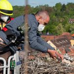 Neustadt – Die Feuerwehr Neustadt war erneut mit ihrer Drehleiter (DL) für die Aischgründer Weißstörche im Einsatz (siehe Bericht vom 22.05.2021). DL-Maschinist Christian Schäfer und Feuerwehrmann Robert Kemeter unterstützten in gewohnter Weise Dipl.-Biologen Jens Heber und die Storchenbetreuerin Heike Seefried.