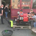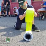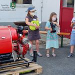 Für die Gruppenstunde standen zwei Reserve-Tragkraftspritzen zur Verfügung, an denen die Mädchen und Jungs Strahlrohre, Verteiler, Sammelstücke … ankuppeln konnten – nachdem sie die Schutzabdeckungen (Blindkupplungen) entfernt hatten. Nach anfänglichem Zögern wurde das Gewusel um die Pumpen immer stärker und die zusammengekuppelten Kunstwerke immer abstruser.