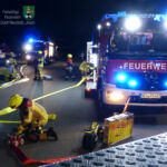 Ein Löschgruppenfahrzeug und das TLF wurden auf dem Nachbargrundstück eingesetzt. Dort bauten sie eine Saugleitung auf, entnahmen damit aus einem unterirdischen Behälter das benötigte Löschwasser und gaben es über den auf dem Dach des Tanklöschfahrzeugs befindlichen Monitor auf das vermeintlich brennende Objekt in der Werner-von-Siemens-Straße ab.