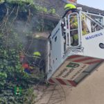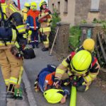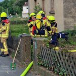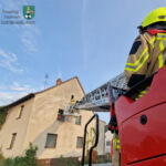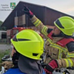 Beim weiteren Absuchen der verrauchten Bereiche fanden die Atemschutztrupps noch drei weitere Personen. Diese wurden ebenfalls in Sicherheit gebracht. Bei zwei dieser Verletzten kam für ihre Rettung die Drehleiter zum Einsatz. Nachdem das Wohnhaus abgesucht war, dauerte es nicht mehr lange, bis auch die simulierte Brandbekämpfung abgeschlossen und „Feuer aus“ gemeldet wurde.