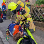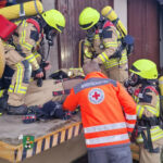In diesem Übungsabschnitt wurde ein Atemschutznotfall eingespielt: Ein Trupp hatte ein „Übungs-Mayday“ abgesetzt, weil sich ein Kamerad fiktiv verletzt hatte. Nun war es am sogenannten Sicherheitstrupp, einzuspringen und die Kameraden schnellstmöglich zu retten. Der verletzte Atemschutzgeräteträger wurde nach seiner schnell erfolgten Rettung in die Obhut der BRK-Ehrenamtlichen übergeben. Das Auslaufen des „gefährlichen Stoffes“ konnte danach (die Kameradenrettung hatte höchste Priorität) ebenfalls erfolgreich unterbunden werden.