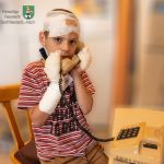 Wichtige, ja lebenswichtige Themen standen bei der Kinderfeuerwehr auf dem Stundenplan! Erste Hilfe und der Notruf waren die Übungsinhalte der Gruppenstunde am 14. Juli. Die 18 Kids wurden in zwei Gruppen geteilt. Betreuerin Steffi und Feuerwehrmann Robert (auch ausgebildeter Rettungssanitäter) erklärten und zeigten den Kindern, wie verschiedene Verbände und Trageschlingen angelegt werden. Mit großem Interesse und ebensolcher Begeisterung gingen die kleinen Feuerwehrfrauen und -männer zu Werke. Sie „wickelten“ alles ein, was ihnen unter die Mullbinde kam: Vom Kopf über Arm und Hand bis hin zum Fuß – alles.