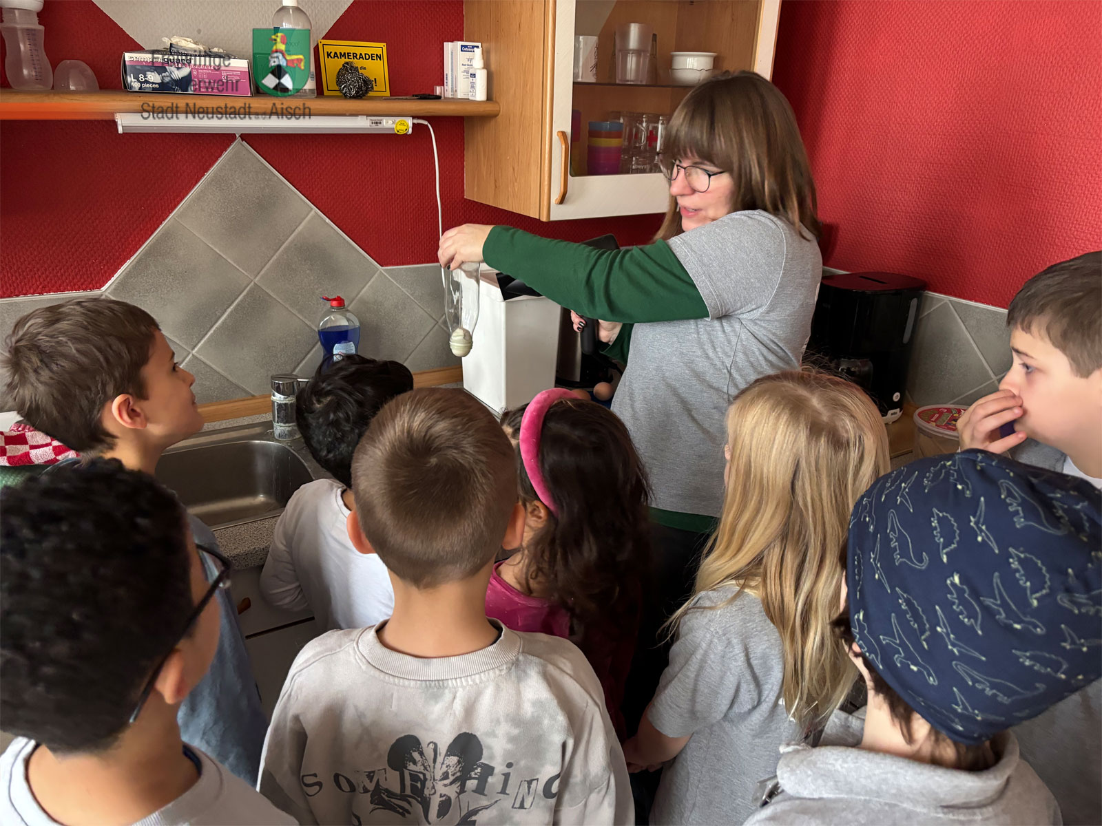 Beim Experiment „zauberten“ die Kinder mit ihren Betreuerinnen ein Ei in eine Glasflasche – und auch wieder heraus! Dazu haben sie ein gekochtes und geschältes Ei auf die Öffnung einer vorher erwärmten Flasche gesetzt. Dann wurde die Flasche unter kaltes Wasser gehalten. Nach kurzer Zeit flutschte das Ei in die Flasche – aufgrund des beim Abkühlen im Inneren entstehenden Unterdruckes.