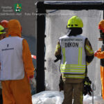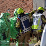Nachdem es bei dem Milzbranderreger um ein hochgiftiges Bakterium handelt, rüstete sich bereits der erste Trupp mit Chemikalienschutzanzügen (CSA) aus, ehe er das vermeintlich betroffene Gebäude zur Erkundung betrat. Währenddessen richteten die anderen Kräfte den Dekontaminationsplatz ein und bereiteten geeignetes Desinfektionsmittel vor. Auch die Mitarbeiter des BRK legten zu diesem Zeitpunkt Vollschutzanzüge an.