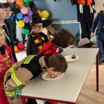 Verschiedene kurzweilige Spiele ließen die Gruppenstunde für die 17 Kinder wie im Fluge vergehen. Die Jungs und Mädchen vergnügten sich beim Schokokusswettessen, beim Abknabbern von aufgefädelten Brezeln (jeweils ohne Einsatz ihrer Hände), bei einem Verkleidungswettrennen sowie dem Stopptanz und spielten „Reise nach Jerusalem“.