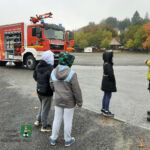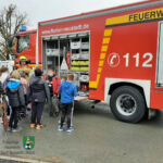 Zum Abschluss der Übungseinheiten durften sich die Mädchen und Buben der Mittelschule noch das große Feuerwehrfahrzeug, das am Rande des Übungsgeländes die Straße absicherte, von Jörg Meyer erklären lassen. Vor allem der fernbedienbare Dachmonitor, umgangssprachlich Wasserwerfer genannt, des Tanklöschfahrzeugs 4000 begeisterte die Kinder.