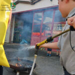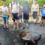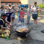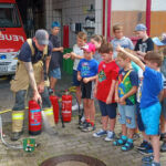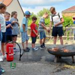 Nach Florians Erklärungen wurde es spannend: In mehreren Experimenten erlebten die Kinder, wie schnell Stroh, Laub oder Zweige in Brand geraten können, beispielsweise ausgelöst durch eine achtlos weggeworfene Zigarette. Die kleinen Brände in der Feuerschale löschten die Kinder selbst mit Löschrucksack oder Übungsfeuerlöscher – erfolgreich, versteht sich!