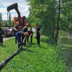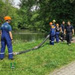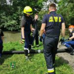 Insgesamt 15 Jugendliche machten sich mit ihren Jugendwarten und Helfern mit mehreren Fahrzeugen – u. a. hatten sie die Flachwasserschubboote des Landkreises dabei – auf den Weg zur Aisch nahe der Wasenmühle. Dort übte ein Teil der Feuerwehranwärter die Wasserentnahme aus offenem Gewässer und den Löschangriff. Der andere Teil befasste sich mit den Booten und machte ausgiebige „Probefahrten“ auf dem Gewässer, anschließend wurde getauscht.