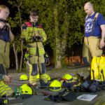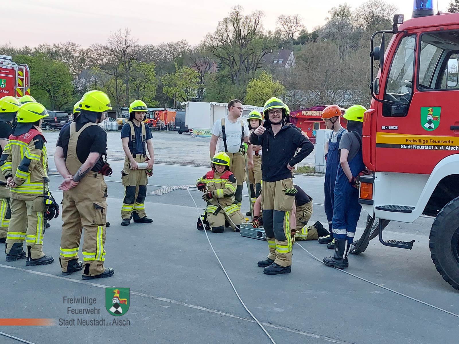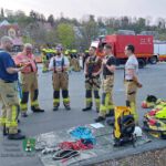 Danach fuhr die Mannschaft gemäß der im Vorfeld erfolgten Einteilung mit insgesamt sieben Fahrzeugen zum Festplatz. Dort wurden vier Gruppen eingeteilt. Zwei Gruppen beschäftigten sich mit Seilwinden und dem Mehrzweckzug. Die anderen beiden Gruppen hatten die Themen Heben und Bewegen von Lasten mit der Drehleiter und Basiswissen Gerätesatz Absturzsicherung. Nach einer guten Stunde wurde getauscht.