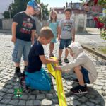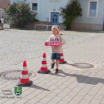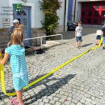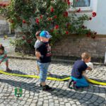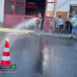 Drei Stationen hatten sie für „ihre“ Kinder vorbereitet. Die erste hieß „Zielspritzen“. Hier lag ein Tennisball auf einem Verkehrsleitkegel. Die Aufgabe der Kinder bestand darin, den Ball mit einem D-Strahlrohr gezielt herunterzuspritzen.