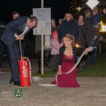 Nach dem Durchschreiten des Fackelspaliers und den offiziellen Glückwünschen galt es für das Hochzeitspaar eine brennende Fackel gemeinsam, quasi als „Ehe-Trupp“, mit der Kübelspritze zu löschen. Eine Aufgabe, die beide zusammen in kürzester Zeit mit Bravour meisterten!