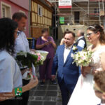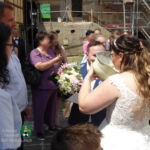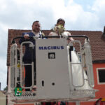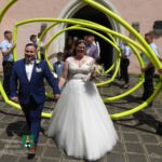 Nach seinem Traugottesdienst durchschritt das Hochzeitspaar das Schlauchspalier „seiner Feuerwehr“. Stellvertretender Kommandant Christian Klama und Vorsitzende Sandra Baum übernahmen die offizielle Gratulation von Feuerwehr und Verein und wünschten den beiden für ihre gemeinsame Zukunft alles erdenklich Gute. Nach der Überreichung eines Blumenstraußes an die Braut und einer kleinen Aufmerksamkeit für das Paar servierten sie ihnen ein Glas Sekt – mit der Besonderheit, dass dieses in einem Feuerwehrhelm befestigt war.