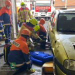 Zunächst erhielten die Jugendlichen die Info, dass in einer KFZ-Werkstatt eine Person unter einem PKW eingeklemmt sei. Als die Feuerwehranwärter an die Einsatzstelle (Waschhalle im Feuerwehrhaus) kamen, stellten sie fest, dass ein PKW mit einem Vorderrad in der Montagegrube hing und eine Person (Übungspuppe) unter dem Fahrzeug eingeklemmt war.