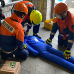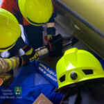 Im Anschluss hoben die Einsatzkräfte mit dem Rettungsspreizer den PKW an und schoben entsprechendes Unterbaumaterial nach, um jegliches Absacken zu vermeiden. Nachdem das KFZ entsprechend angehoben worden war, konnte der Verletzte gerettet und (fiktiv) zur medizinischen Versorgung dem Rettungsdienst übergeben werden.