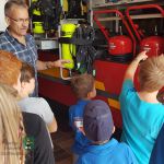 Gespannt und interessiert – und ohne jede Angst! – verfolgte der Feuerwehrnachwuchs die „Vorführungen“ und Erläuterungen. Danach besuchten die Jungs und Mädchen die Atemschutzwerkstatt und durften viele Ausrüstungsgegenstände „begreifen“. Zum Abschluss nahmen sie zusammen mit Feuerwehrmann Lukas in einem Löschgruppenfahrzeug Platz und halfen ihm im Mannschaftsraum beim Anlegen seiner umfangreichen Atemschutzausrüstung.