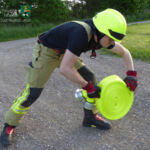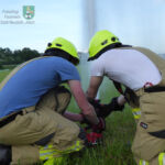 Im Mittelpunkt der Übung stand anschließend die präzise Handhabung des Dachmonitors sowie die zielgerichtete Bedienung des mobilen Wasserwerfers. Das Wasser für ihre fiktive Brandbekämpfung entnahm die Gruppe aus der Aisch. Dazu bauten sie eine Saugleitung auf, mit der sie das Löschwasser aus dem Fluss saugten und mit dem Löschgruppenfahrzeug zum Tanklöschfahrzeug förderten.