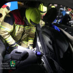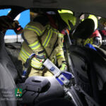 Ein weiteres Übungsthema war die Schaffung einer großen Seitenöffnung an einem verunfallten Pkw. Hierfür wurden mittels Rettungsspreizer und Rettungsschere die vordere und die hintere Tür entfernt. Anschließend schnitten die Feuerwehrleute die sogenannte B-Säule heraus und schafften so eine große Seitenöffnung, die sich über die ganze Länge des Innenraums erstreckte.