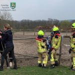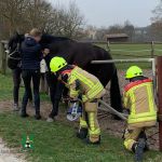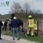 An der Einsatzstelle in der Hans-Böckler-Straße stand bzw. hing ein Pferd über dem Metalltor einer Koppel. Ein Hinterlauf des Großtiers hatte sich zudem in der diagonalen Strebe des Tores verfangen.