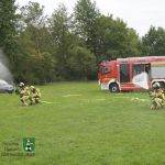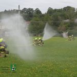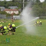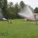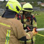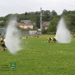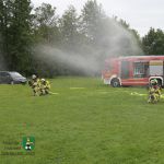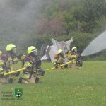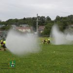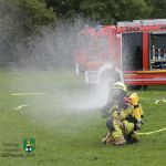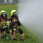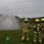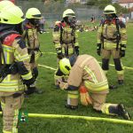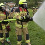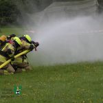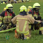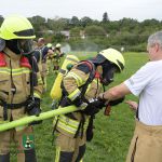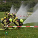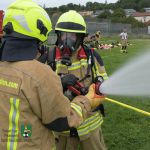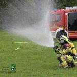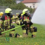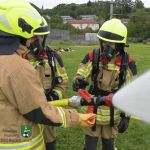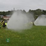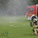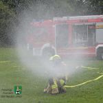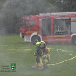 Nach einem gemeinsamen Mittagessen stand der zweite und praktische Teil des Tagesseminars auf dem Bolzplatz hinter dem Sportgelände am Festplatz auf dem Übungsplan. Wo sonst Freizeitsportler ihre Fußballkünste trainieren, absolvierten die insgesamt 18 Teilnehmerinnen und Teilnehmer zunächst einfache praktische Übungen mit den Hohlstrahlrohren. Ziel der Einheit war es, die Strahlrohre – oder wie es der Ausbilder bezeichnete „die Waffe des Feuerwehrmannes“ – blind bedienen und effektiv einsetzen zu können.