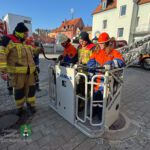 Die Jugendlichen übten mit ihren Jugendwarten zunächst den Umgang mit dem Spineboard und der Schleifkorbtrage sowie deren Einsatzmöglichkeiten. Der Höhepunkt der Übung war zweifelsohne die Drehleiter: Erst erläuterte Feuerwehrmann Uwe Machetanz den Jungs und Mädchen das Fahrzeug und seine besonderen Anwendungsoptionen, ehe sie gemeinsam mit den Jugendwarten im Rettungskorb hoch hinausfahren und „eine Runde über die Dächer Neustadts drehen“ durften.