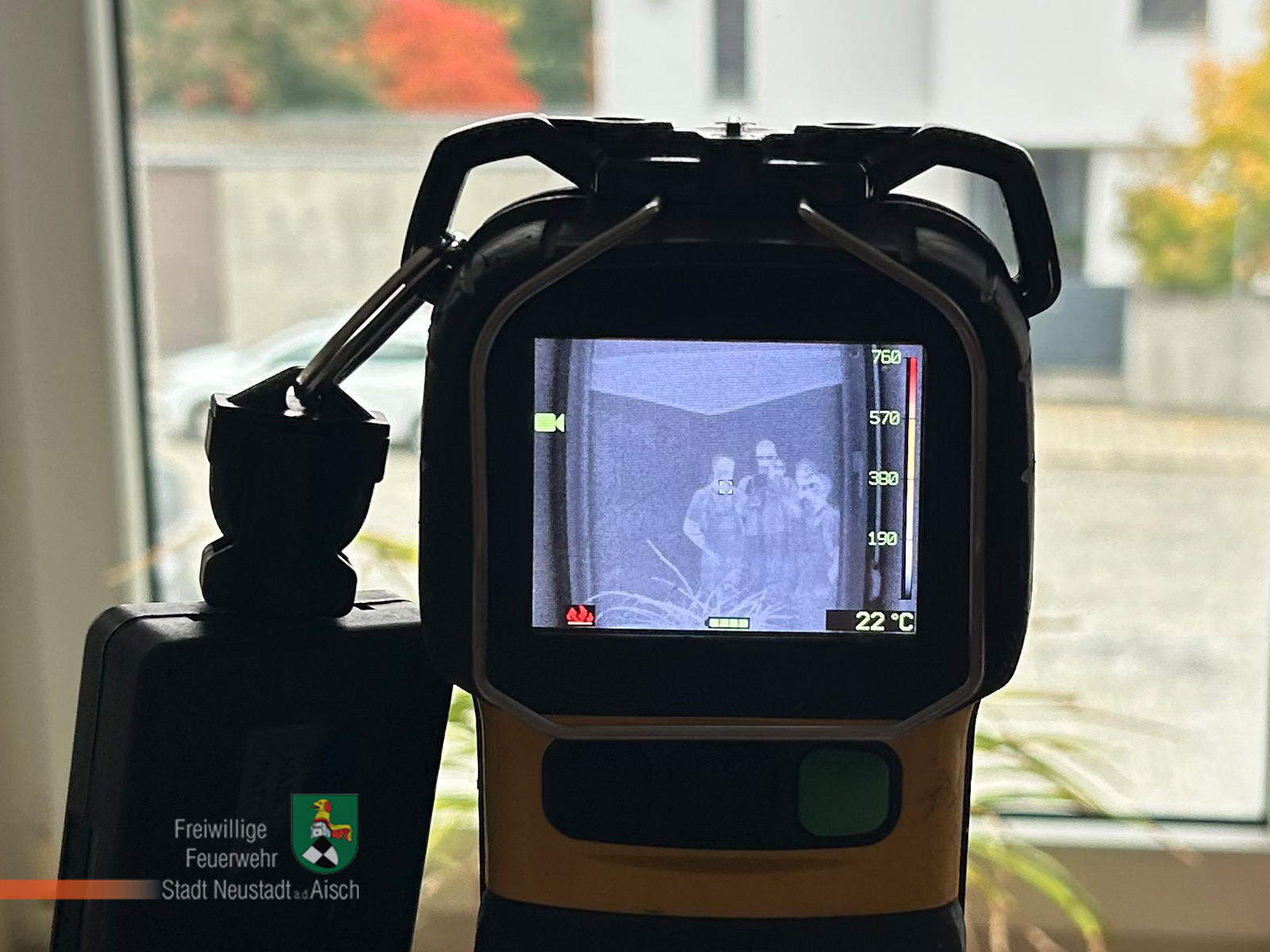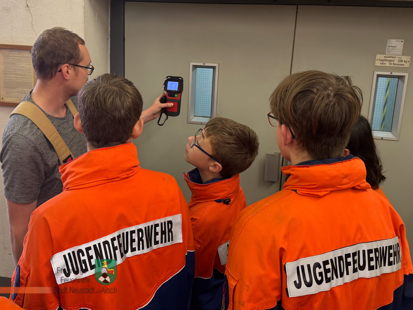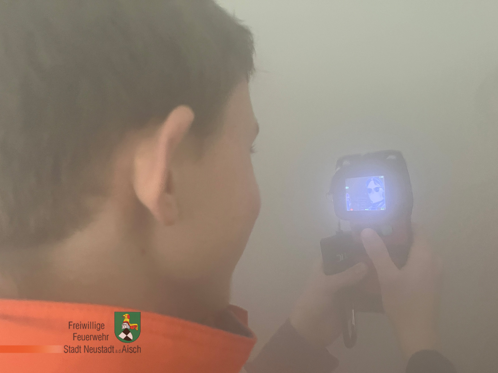 Parallel zur Jugendfeuerwehr-Übung fand eine Gruppenstunde der Kinderfeuerwehr statt, bei der eine verrauchte Werkstatt als Übungsszenario diente. Diese Gelegenheit nutzten die Jugendwarte, um den Jugendlichen den praktischen Einsatz sowie die Vor- und Nachteile einer Wärmebildkamera zu demonstrieren.