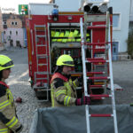 Die Station „Wasserentnahme aus Faltbehälter“ beinhaltete den Aufbau eines Behälters und einer Saugleitung sowie eines Leiterbocks. Mit Hilfe der Steckleiterkonstruktion konnte die Saugleitung sehr gut zur Entnahme des Löschwassers aus dem Faltbehälter genutzt werden.