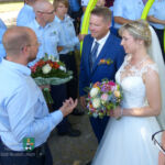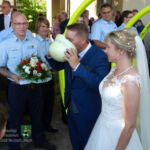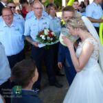 Fast dreißig Kameraden waren zur St. Katharinenkirche in Schauerheim gekommen, um Markus und seiner Ehefrau ihre Aufwartung zu machen. Kommandant Florian Brandt und Schriftführerin Elke Löblein übernahmen die offizielle Gratulation von Feuerwehr und Verein und wünschten den beiden für ihre gemeinsame Zukunft alles erdenklich Gute. Nach der Überreichung eines Blumenstraußes an die Braut und einer kleinen Aufmerksamkeit für das Paar servierten sie ihnen ein Glas Sekt – welches in einem Feuerwehrhelm befestigt war!