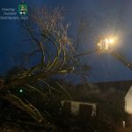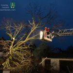 In Herrnneuses war eine Linde mit ca. 80 cm Stammdurchmesser umgestürzt und blockierte die Fahrbahn. Die Mannschaft der Drehleiter unterstützte die Ortsteilwehr Herrnneuses und zerlegte das mächtige Gehölz mit einer Motorkettensäge sicher vom Rettungskorb aus.