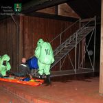 Die „alarmierte“ Feuerwehr rüstete sich u. a. mit Chemikalienschutzanzügen (CSA) und Atemschutz aus und rettete die verletzte Person (Übungspuppe). Alle kontaminierten Personen mussten nach Verlassen der Unfallstelle zur zwischenzeitlich eingerichteten Dekon-Dusche. Hier wurden der Verletzte und die Retter gereinigt sowie die verunreinigte Ausrüstung separiert.