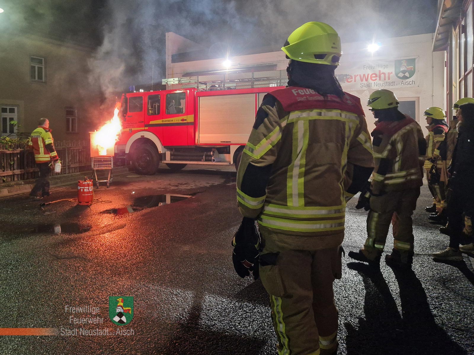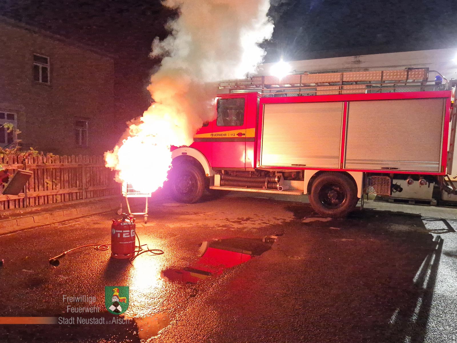 Als Zugabe hatte Markus Stenglein noch eine selbstgebaute sogenannte „Flashover-Box“ dabei. Mit dieser Konstruktion demonstrierte er den Übenden die Entstehung und den Ablauf eines Flashovers und die damit einhergehende Rauchentwicklung und Flammenbildung.