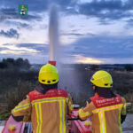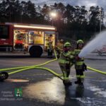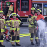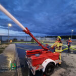 Der letzte Teil der Übung widmete sich dem auf einem Anhänger verlasteten Schaum-/Wasserwerfer – inklusive eines „nassen Praxistests“, der eindrucksvoll die große Wurfweite des Werfers aufzeigte.