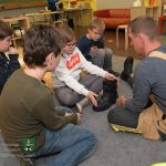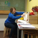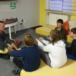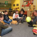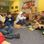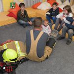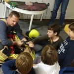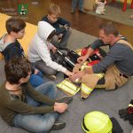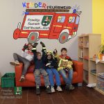 Kinder und Kommandant saßen im Gruppenraum zusammen und besprachen gemeinsam, mit dem Helm beginnend, Jacke samt Sicherungssystem, Handschuhe, Einsatzhose und die Sicherheitsstiefel. Kommandant Schöner erklärte geduldig und kindgerecht, stellte aber auch Fragen in die Runde. So erfuhren die Kinder, dass die Einsatzjacke etwa 800 Euro kostet und ein Paar Feuerwehrhandschuhe nur ca. 80 Euro. Die Kids wissen nun auch, welche Hitze die Einsatzuniform aushält und an welcher Stelle Stahlverstärkung in den Stiefeln verarbeitet ist. Weiterhin erklärte ein Junge, dass die Einsatzhosen deswegen Träger haben, weil ohne der Feuerwehrmann beim Springen die Hose verlieren und in Unterhose dastehen würde!