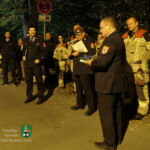 Um 18:30 Uhr traten die Feuerwehrfrauen und -männer vor dem Schiedsrichtergremium, bestehend aus Kreisbrandinspektor (KBI) Florian Sacher und den Kreisbrandmeistern (KBM) Karl-Heinz Köberer und Dieter Popp, an und stellten sich den Prüfungen. Sie bewiesen den Schiedsrichtern und einigen Zuschauern, darunter Angehörige und Kameraden sowie Dritte Bürgermeisterin Heike Gareis, dass sich die intensiven Vorbereitungen (mehr als 300 Übungsstunden kamen zusammen) auszahlten. Jeweils mehrmals hatten sie im Laufe der vorangegangenen Wochen unter Anleitung von Stefan Herzog, Fabian Schmidt und Günther Wehr die Abläufe exakt einstudiert und die relevanten Handgriffe ausführlich trainiert. Beide Gruppen bestanden die Leistungsprüfungen mit Erfolg und konnten ihre Leistungsabzeichen aus den Händen von KBI Sacher verdient in Empfang nehmen.
